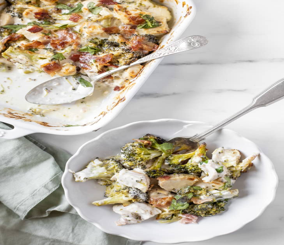 - Add the chopped chicken breast, steamed broccoli, 3 chopped slices of bacon, and fresh parsley or cilantro to the casserole dish.